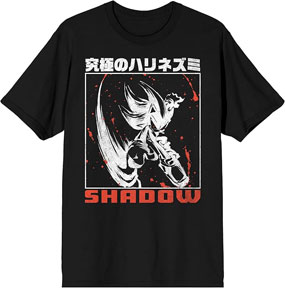 | It has his name in red along the bottom...but what does the white text say in Japanese at the top? This is costly for some reason at Hot Topic, it is about 45 dollars. The tee at right appears here too, but it is by Bio World, and why it appears (it's just a variant item) is because Bio World litertally titles this Shadow Blood Spatter Tee. It's the first time 'blood' is ever referenced on a Sonic merchandise. (There have been hidden skulls (human skulls, that is) on at least 1 thing, but this is the first known Blood reference) While this is up on Amazon, you can read the title for yourself. Interesting. |