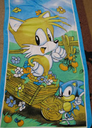 This might be a bit cute if it wasn't so...random. Happy Tails is the main focus of this curious towel. But look carefully at the Tails. Where is he? In the wheel-barrow? Behind it? You can't really tell...because they just slapped him on there. Then, they've stuck on a little stock Sonic in the corner, out of proportion to everything else, but too big to be a logo! Keep looking...and you'll see that his shoes are GREEN! All the other colors in the photo are accurate so...And one more detail is also missing: Sonic's mouth! This is somewhat typical of fake items, they leave off details, or change colors for some reason. This leaves you with semi-abstract re-colors of your favorite characters on sub-standard goods. Don't buy bootleg stuff! Also to note: there IS an official version of this towel, with all the correct details, good art and proper coloring. Always inspect items before you buy. |