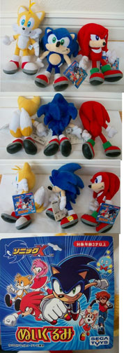 Here's a set of 3 Sonic X themed plushes. You could get Sonic, Tails & Knuckles. The Tails especially looks quite like he did in the show (notice the white face edges) These are SegaToys brand, & about 10 inches high each. Since it's Sega, they always produce a quality product. Photo discovered by MrCalistine | |||||||||||||||||||||||