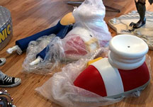 Most big items are not shipped whole, unless it can't be avoided. Large Sonic statues are no exception! Here's an interesting shot of the faux-steel-plate base one being assembled in USA Sega HQ. This gives you the idea of the size, and you can see that it likely has 8 parts. (Head, arms, body/legs/2 feet, nose, base) Photos discovered by Taaron. | ![]() |