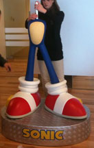 At E3 (Electronic Entertainment Expo) in the USA one year, this cool Sonic statue was spotted. It could be from any era, as he is not wearing anything to distinguish which game he could be promoting. (no soap shoes/gold bracelets etc) This is a nice looking statue, and from the front it seems rather accurate. You can see the buckles on the sides of his shoes, and that his hands are well done. Also note that it is bolted to it's base to help secure it. Photo by Sonik Kokiri | ||||||||||||||||||||||