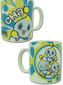 | Wow chao farmers! Here's a great mug for chao lovers...because it features ONLY chao! This is the Neutral Chao mug by GE in 2015. It's cute, and well designed with splashes and curves of blue and yellow color. A happy chao on one side lends the hovering head dot to the word for the letter "o", and is next to the modern Sonic logo. The other side of the mug has a circle with 3 chao in it. One is thinking, one is cheering and the other is jumping up happily. GE is clearly continuing their streak of well designed character spotlighting merchandise. Not every Sonic item needs Sonic on it, and it's great for fans of every character to see them putting good thought and design into other character solo merchandise like this. |