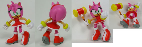 | It took all the way until the end of the year in Fall 2021 but... Jakks Pacific finally releases an Amy Rose figure. She's here on their 5 inch action figure line. They choose Modern Amy to go first, and of course, her accessory is the piko piko hammer. She has one hand posed to be able to hold it. They've given her a cheerful, mouth open smile expression. The paint job is as usual, quite good, so she looks nice here. The head sculpt is good, very game-like and everything is proportional. The box has 30th Anniversary branding now included on the bottom card under the logo, as well as the red foil 30th sticker that's generally at the top now. She appears on a wave with oddly colored (pale) Sonic & Tails. Photo discovered by |