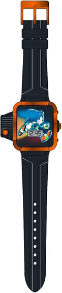 This is the Accutime Flashlight Watch. Combining watches with other things is nothing new, but this is likely the first Sonic flashlight watch. That big rectangle thing on the side there is the LED flashlight part, activated by the orange button on top. The watch face here is mostly square, with a running modern Sonic art, and LCD small screen for the time. (If it's not backlit though, you can't use the flashlight to see the time in the dark!) The strap is the usual plastic. It is about 12 dollars and is seen on Amazon. | ![]() |