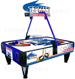 This is an air hockey table from the "Sonic Sports" Line. It's a large arcade size table with an all-Sonic theme. The pucks have the Sonic X face logo in black and white, the strikers are blue & red, and the side of the game says "Sonic All Stars" on the side with a stars graphic. The table top Has a very big all-over graphic of modern Sonic. | ||||||||||||||||||||||||||||