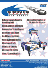 The top features a 'spin' like decoration and headline as well as the scoreboard, and score lights. The clear center divider says "Sega" on it. Above is the factory photo for the game, which is large. It's 70 inches high and 87 inches long. It also weighs 385 lbs. The top is polycarbonate, the sides are aluminum with edge bumpers. It uses chaser LEDs, displays score & time, and can be set for 2 or 4 players as well as having a ticket dispensing option Want to see it in action use Air Hocky Video. The spec sheet (at right) describes all the features and shows that it is from Sega Amusements Europe, even though it is in England. (So, it could appear at arcades throughout Europe) Highway Games may sell this game (if you are an arcade) This looks to be a stylish, sturdy and cool game to play. Hopefully it appears at many arcades starting in 2009! It has a webpage at Liberty Games Photo discovered by Kirbycrew. |