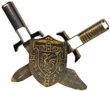 Here's an ad for a "Free Combat Pack" if you preorder Sonic & the Black Knight from EB Games in Australia. But just what is a 'combat pack'? It's a set of all-foam and plastic mini sword and scimitar-like replicas, with a tiny shield. You can snap the wiimote into the sword handles and the nunchuck attachment goes behind | |||||||||||||||||||||||||||