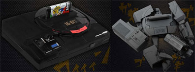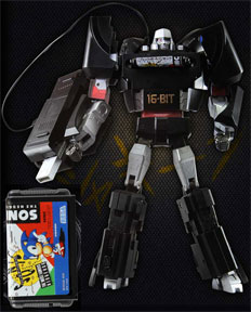Wow, a cameo ITEM! This is "MegaDrive Megatron" he's a real Transformers toy with a cool cartridge addition! Even though he is a bad guy, he turns into the Sega Megadrive AND has a repro original Japanese-look (The Japan cartridge was different than the USA / EU ones) Sonic 1 cartridge. At left, it looks like a normal Megadrive...but then (transforming image is of a non-painted one) it turns into a decepticon! |