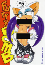 Here are the rest of the covers to the Furry Bomb series. Why is Rouge so surprised? The skirt like item is her outfit from where she appeared in Sonic Riders--so you know a likely date for the book. There isn't actually anthing X-Rated at cover #4, however, a "rude gesture" is covered by the censor plate. (Tails isn't a bird, but he's flipping the bird here) |