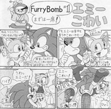 This is "Furry Bomb" It is an "X" rated series! The author tries different romance stories using the Sonic characters. The covers are color, with the inside pages being black/white. You can see the quality of their art/style. These were all apparently done after Sonic Adventure 1, due to the character variety inside. This book series sometimes uses Sonic as a "promised hook" to get you to buy it, then substitutes unrelated things which are X-rated. Some books of this series do not contain anything Sonic at all. There are several "releases" of this book (ie. 1.5, 2.5) which only re-use old stories and add few new items, another ploy to trick fans into buying. A hazard of Doujinshi is that they are NOT regulated, so tricksters can try dirty ploys to lure people to buy.... |