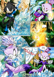 The Palcomix Circle can be commissioned. Since it's not based in Japan, this circle can be commissioned to do books or (likely) art. Here, someone has commissioned a story featuring their own fan-character an ice-wielding cat. He fights and tries out a romance with Blaze the Cat in this side-story type comic book. All the dialogue here is in English also. |