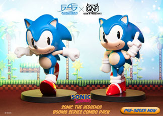 Together, Boom8 (nothing to do with Sonic Boom) Freak & Geek Toys and First4Figures teamed up to make...well, more figures! This "Boom8" series will consist of small size PVC display figures that come in nice collector boxes. Because the figures are on bases, they can have cool poses that you normally wouldn't be able to do. The first figure is 'finger waving' Sonic & the second one is running Sonic. The figures are basically 3D representations of the classic stock art done RIGHT. A lot of the little minifigs & such would try to replicate the stock and fall short, but these, as you can see here with their multiple angle photos are doing a great job no-matter how you look at it. The boxes have a good big window so you can see the figure without taking it out. They also appear designed to keep it in place/safe for shipping. You can probably also remove it & put it back without destroying the package. |
