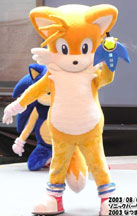 This is a rather cute photo. A Tails mascot is peeking over the guard rail at a stairwell somewhere. By the nature of the hanging poster/banner, and machine in the background it looks likely to be an arcade. Why the suit is peeking is anyone's guess, but it makes for a rather cute scene. The suit looks nicely detailed as well, with a very nicely made head. Photo discovered by: Sky1234 |