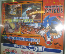 This is an ad found in Joypolis at the time. It's under plexi, but you can tell it's for their halloween event. It has a seldom-seen art of Sonic in a cape, with a walking stick. He's offering to the viewer a jack o lantern which is wearing a witch hat, as bats fly in the background. Curiously this is the 2nd official time that Sonic has been portrayed dressing up as a vampire or 'spooky gentleman'. All photos in this section provided by The Honeymooners. |