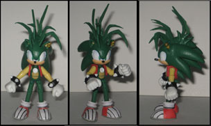 This is a customized Manic figure from Sonic Underground. He's made from a Jazwares 3.75 line Sonic, with Tails shoes. He has craft foam spiky hair, rubber jacket accessory & sculpted details for his spiked bracelets, drum medal & gold earrings. With a custom all green paint job, he looks like Manic from the show. All customized & photo by WakeAngel | ||||||||||||||||||||||