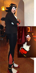 Here's a fan cosplay for Shadow the Hedgehog. The shirt has chest fur detail, & arm stripes. The gloves & customized sneakers have the gold rings for the cuffs. Instead of a whole head mask (mascot like) this costume uses makeup & custom spike hat to complete the look. Costume made & worn by Nina | ![]() |