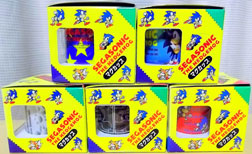 A Set of 8 glasses from Sonic Adventure, when it first came out for the Dreamcast. E 102 Gamma, Knuckles, Eggman, Big, something, a Chao, Sonic and Super Sonic. But what's that last 'something' ? These were originally thought to be from Australia...were they released in 2 countries? Just Japan? Write in if you have any proof/details about this cool set. |