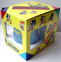 This mug is rather busy, with repeating names, and stock art Sonics running all over. These are the "Rounder style" Sonics from the very early days...except for the laying down one, who is from Sonic CD era. The box is rather cute, with Sonic and Tails sprinkled all over. | ||||||||||||||||||||||||||||||||||||||