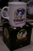 Here is a valuable mug. As you can see the desin is probably a chrome-effect of some kind, or a very stylish silver fade. This mug is quite well done, with a feature visible from every angle. Sonic overlaps the text (still legible, though) and it has a nice big redition of the quote on the side. This mug is uncommon, as well as being well done. Many people like the design, so it is a real gem if you can add it to your collection! MIB photo discovered by Berzerker. | ||||||||||||||||||||||||||||||||||||||