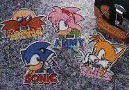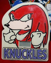 What are these curious items? Digital clocks! Though, the 'clock' part is very small, it is only in that tiny window in the center...so they resemble light-switch plate covers. Here you can see the interestingly shaped box they came in, as well as that "Amy Rose's" clock has her name spelled wrong! Yes, they apparently DID slip up on official goods: "Ammy" is written on her clock. These were supposedly obtainable from UFO catcher machines. The design and edges are also slightly raised, if you look closely at each clock. It looks like a thick paint was used. Obviously if there are Amy and Knuckles clocks, there are also Sonic & Tails clocks. Photos will appear here when they are submitted. Each clock is about 3 inches high. Amy clock photo by Rhia, and Knuckles clock photo & info by Smindas |