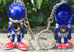 Now THIS is a cool keychain. If ever a keychain were to be 'tough' this one would be it! An ultra rare, ultra interesting Metal Sonic keychain! And it's a completely 3D figural as well! What makes this even better is the accuracy and the great job they did with it. The thing is spot-on! Check out the metallic silver and gold-tone paint, as well as the 3D details for the shoulder cuffs, engine well, and shoe bolts. What did they do with all the pointy fingers? Cleverly, they set the hands on the |