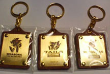 Here are 3 nice brass (or brass-look) key chains. Each one is a flat smooth oval with classic clip top. The designs are well done and detailed. Each one is etched on with a frosted effect to the metal. Look at cute Tails sitting down! It's not a design you see often. Sonic is jumping and so is Eggman. Each one says "SegaSonic" below it, with the characters' name. The bottom has the copyright.