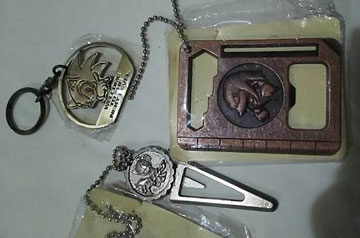 There's the engraved/textured flat metal keychain, a difficult to see white-ish one & the textured figure Sonic & Tails in brass-tone at the bottom. Notice how those are the same textured/pose/figure from the 'spinner keychains' only not mounted onto an oval. Photo from Hikari Site. | |||||||||||||||||||