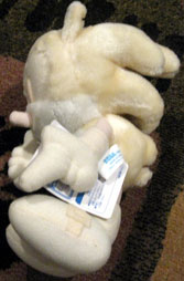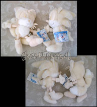 The two in the background are simply made using only lighter-than-normal colored fabric. They appear slightly 'washed out' but the quality shows they're not simply bleached. The two in the front are some bizzarre albino version of their normal selves. These are MUCH rare-er. They even have these vaguely-colored white plastic eyes. They're actually somewhat creepy if you get close. This is a photo of their actual hang-tag, by Sonikku. |