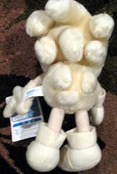 Now you can see the pale Sonic from all angles. Every detail is there (even his shoe buckles) just all in white. This is quite an interesting doll to see, and seems to be based on an earlier big finger style plush. Photographed and owned by: Sonikku. | ||||||||||||||||||||||||||||||||