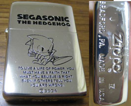 Here is an engraved Zippo Lighter. Is it official, or was the engraving done after it was made plain? (As in, was it an ordinary lighter that was customized) It's difficult to know, because a flat metal surface like that is super easy to engrave. It has Segasonic logo at the top on the flip up lid, and 'laying-waiting/finger tapping' Sonic from the Sonic CD sprite as the graphic. Under him, is the "life of power" quote, along with the Sega logo. The bottom edge is branded for Zippo. Because lighters like this are mostly for cigarettes, it's uncommon. However, there ARE Sonic ash-trays too, even though smoking is bad and Sonic would never endorse it. It's a confusing item. Photo discovered by @JapanAnimePosters on Instagram |