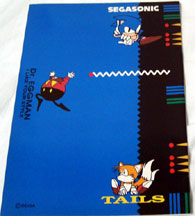 Here's a cool note book to keep your assignments. The front cover is styled quite similarly to several of the Japanese versions of their old Sonic game boxes, with lines, zigzags and dots. It has glove-pulling Sonic and the "Life of Power" quote. The back has some of the rare-er Japan stock arts, including sitting Tails and laying Sonic. It says "Dr Eggman I Like Your Style". The interior features pale blue 'watermarking' with leaping Eggman in the bottom left corner, Tails in the bottom inside corner, and Sonic hidden among the ltters of his name at the top. You can see several different levels of fade were used to decorate the inside. Over-all this is a wonderful and detailed notebook both inside and out! Photos discovered by: Calistine. | |||||||||||||||||||||||||||||||||