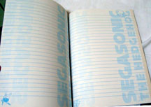 This is a mini spiral notebook. It's rather old, as you can see by the Segasonic name at the cover's edge. This notebook is somewhat unusual as it uses a continuation of the front cover art, for the back. In this case, it's a split image from one of the screens of the old Sonic PC Screensaver. (all the art was done in a single, recognizable style) Which, in this case the scen was Sonic in Space with the space station, Tails and Eggman along for the ride. This was available in the USA as well, as an import in Sanrio stores in 1993. Photographed & owned by SonicToast. | ||||||||||||||||||||||||||||||||