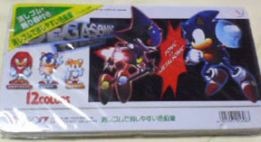 A 3-Pencil Pack. This is simply a carded pack of 3 ordinary Sonic theme pencils. In a somewhat unusual touch (for Japan) these actually have erasers. Finger waving stock Art Sonic is repeated all over every white pencil, and several stock arts are on the card packaging. What does it say at the top? "Pencils". The bottom just has Sega Copyright. Photo by SegaFreak. |