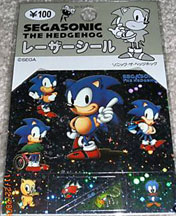 Here are some classic fun glittery stickers! These sticker sets are by Sanrio, and likely came out around the time of Sonic 1. They feature enemies like Ball Hog, Crab Meat, Roller and Chop Chop as well as Eggman, animals and of course plenty of Sonic. Each sticker set seems to share the same speckled foil backing (seen most clearly on right-side set). On the back of each card is an extra for you, with games, mazes, character profiles & more. It appears each set cost 100 yen at the time of release. (Note that the Sonic with Bike image is from the early Japan Sonic ScreenSaver set of professional artwork. | ||||||||||||||||||||||||