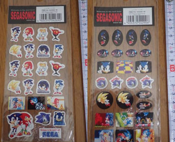 Here are 3 different classic Sonic stickers. They're all pretty large (notice ruler there next to them) The first is simplest, finger-waving un-shaded Sonic. Next is a shaded arms-crossed pointing finger Sonic (die cut) & last is the same art...but if you | |||||||||||||||||||||||