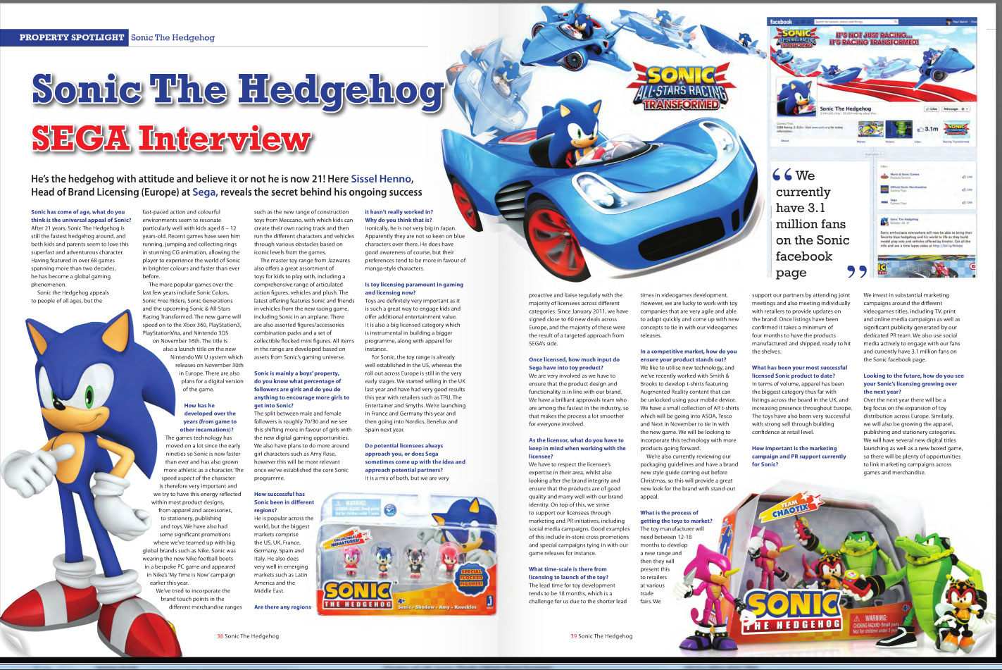 This special page contains a really large magazine scan that you can read. In this case, it's all about Jazwares (and more) and plans for Europe! The things in here that you can read should make European Sonic fans really happy. This was the highest resolution the scan came in, so that tiny type is all the bigger it's getting. You can still read through it for fun facts though. Apparel is the biggest seller so far, they want to do more with Amy, they hope for 50/50 split girls/boys who are fans of Sonic, they want to roll out JW toys all over Europe & Sonic is doing...bad in Japan? What's that! When it becomes the past (instead of a relevent prediction) it should be replaced with another scan that's more relevant. |