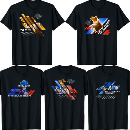 For Movie 3 Amazon lets out tons of tees to hype it up. Fortunately, it placed them all in one spot so that anyone looking could see/get any they wanted. This first batch is all black with that 'paralellogram' type design that the movie stuff likes to use. The first is just Tails, the 2nd is him with "Let's make this count" slogan, next is Sonic "The Blue Blur", an STK portraits one, and then him again with "I'm totally faster". |