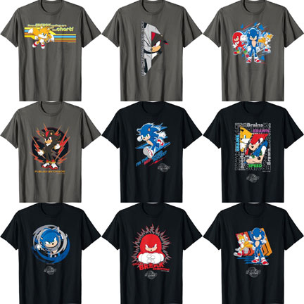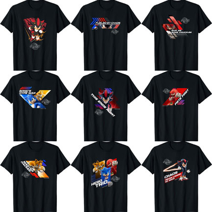 The next set of tees brings 9 more, each with individual styles and no CG art at all. The first has Tails with slogan "Energy Readings are off the chart" the next is "I'm nothing like you" Shadow but done as sketch/color half, STK in splash color, a Shadow with lightening bolts/life form, running Sonic with "I'm the red shoe rocket", STK with Brains Brawn Speed words surrounding the faces, Sonic in a swirl, Knuckles with "Let's break something" & Sonic & Tails art is last. | ||||||||||||||