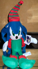 Ho-Ho-Oh-No! This is neither Holly nor Jolly, it is Sonic dressed (badly) as a stupid looking Christmas elf! Now his body is all green, and he has a festive vest and nasty striped hat. They've changed his shoes to elf-shoes as well, as you can see in the bottom of the picture. So basically what this is, is some elf body with a Sonic head sewn on top. It's just bizzarre. Did they have extra Sonic heads from something & needed a good way to dispose of them? Were there somehow headless elves? Who decided this was a good idea? You'll have a holiday of horrors if this is under your tree! Discovered by SuperSonic1497 |