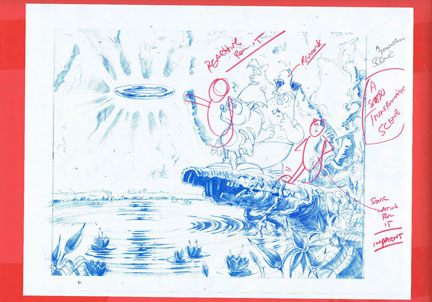 This would be a typical early art item which is a concept drawing of a special scene they wanted to have included, with the red notes on there of what the characters are doing or feeling.