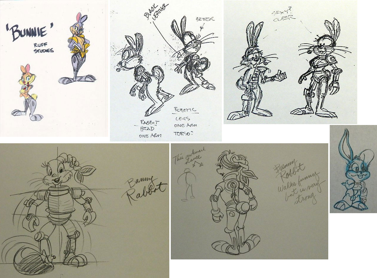 Farthest Left: Another one by someone else/not the main art for the page. This one gives the proportions that she ended up with, as well as the style of the legs and the arm as well as the configuration. The torso here was robotic too, but they dropped it. The head is...basically Babs Bunny from Tiny Toon Adventures. Who, of course...was modeled along side Buster Bunny to be in the exact stlye of Bugs Bunny. The head here was basically tossed out/which so much the better because of the tacky lips and ripped off Warner Brothers "WB" style.