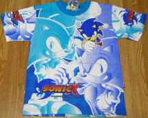 Fashion fright alert! If you leave this shirt photo on your screen too long, your monitor may cry. That's how bad it is. More hot green fading to white, with dark green 'rays' coming out of Sonic for some reason. This does NOT go well with the dark red sleeves, collar, and shoes. The Sonic X logo once again is no help toward this X-treeeme green. The background has a Sonic line art with crossed arms and pointing finger...but it also has raining "Sonic X" words as well as the copyright and Rose Video done vertically. Shirts don't get a whole lot 'louder' than this one... |