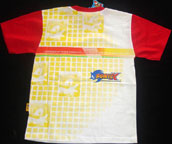 Another decal gets applied with this shirt. It's the same "puffy-sticker" type solid plastice piece set on as an applique of sorts. (the logo is not a part of it) This has a fading grid of light blue (or yellow) squares with various Arm-Cross-Point Sonic X stock art portraits scattered among them. On the fading stripe is the usual "Rose Video" line and copyright information. Blue or red accents top off the design. | ||||||||||||||||||||||