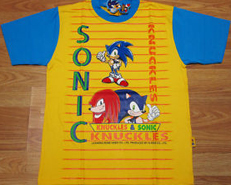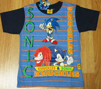 The 'die cut tag' people are at it again, with their bright Sonic shirts in variant colors. These two have a Sonic & Knuckles & striped theme. The Sonic is likely to be a plastic piece. Their names are written various ways all over the shirts and in the 'title tag' like one, curiously Knuckles gets first billing. Again with the kid sizes, but they do go fairly big. Choose your fave color in 2010! | ![]() |