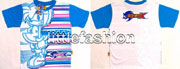 Here's a nice new pattern from this quality mystery company! This time the theme is 'portrait or photo frames' with 3 feature frames (Shadow Eggman Knuckles) each labeled with the character's name, and a scattering of fun colored frames for the background. If you look closely you'll see that the leaping Sonic is another of their thick and curious plastic appliques. The back of the shirt has the same 3 frames again, but in red/white tone or blue/white tone only. It is so good to see that they bother decorating the backs of shirts too, it makes for quite a high quality look. |
