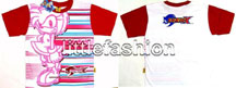 Here are 3 new designs out of the UK. Notice the shaped Sonic tag on each one. Interestingly, there are 2 Amys, one pink, the other blue, with their own pattern of stripes. The Sonic is a normal X stock art, in an 'x' shaped background with an abstracted name on the edge, and logos on the sleeves. All the shirts are highly decorated and nice. But where are they available? Are there better photos? Photos used without permission here...so they are small and marked. |