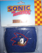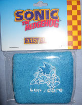 This blue wrist band is interesting, in that the embroidered running Sonic uses a blue that is VERY close to that of the background. This makes the design subtle. Underneath, it says "Top Score" | |||||||||||||||||||||||||||