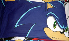 If you found this sheet-set on the shelf, this is what it would look like. They're folded so that the front gets Sonic's eye from the pillowcase, and it seems to come wrapped in a card with the license info on the back, and photo of the set on the front. Sheets MIB photo by SonicTeam | ||||||||||||||||||||||||||||||