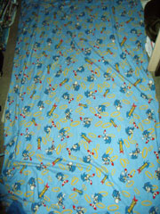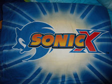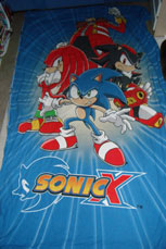 This is a really cool Sonic X themed bed set. It looks like a single, with 1 pillowcase. The case has Chargin' Sonic on the front, with the Sonic X logo on the back. The other part seems to be either a sheet, or a thin blanket of some kind, with part of the cast on the front, and a scattering of Sonic X art and logos for the back. This set is a single-bed type. | |||||||||||||||||||||||||||