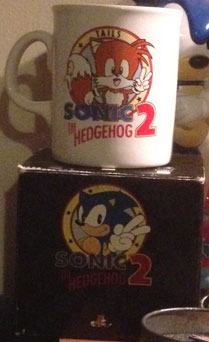 Here's a real cute mug! This was made for Sonic 2 in Japan. It's a mug that stars JUST Tails! Having a solo character on something that's not 'just Sonic', isn't that common in this older era. However, it's good move, because look how cute the art is for him they have used. He's super cheerful looking & doing a peace sign (or number 2 for Sonic 2) The Sonic 2 logo is blow him & he's in a ring shape with his name at the top. The box for the mug is black, with Sonic in a star ring and the logo. The box for all the mugs of this time was the same, no-matter what the design on the item inside was. The mug itself is a plain, white ceramic with smaller size handle. What's unusual about this mug is it is VERY Japanese style, the Sonic on the box is, & the Tails especially is. This is something you'd expect to find in Japanese stores, not in England / UK area. (Remember, with their Segaworld they got wierd/ugly Tails art/brown Tails and other errors quickly...this must have appeared before that started happening. Photo & owned by Lee |
